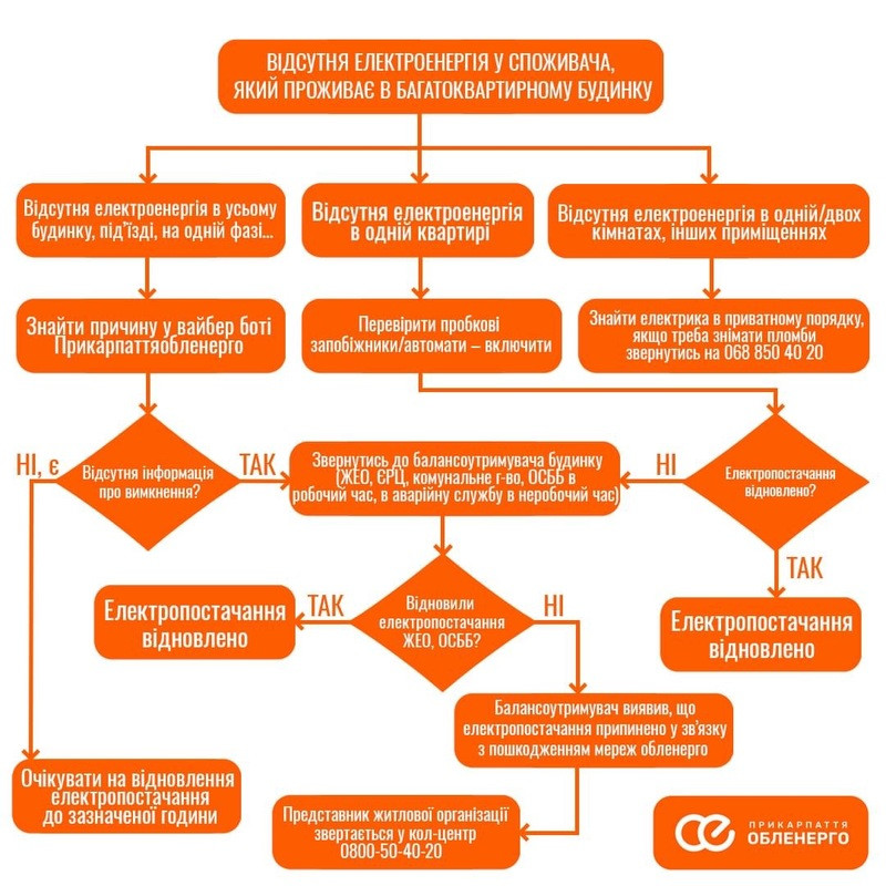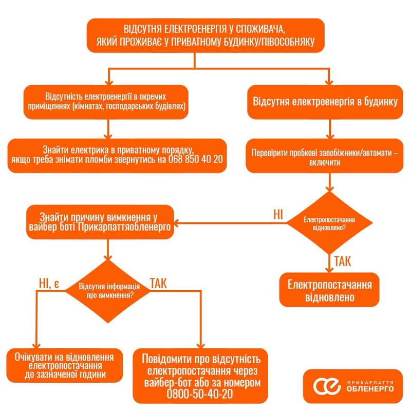 Прикарпаттяобленерго оприлюднило алгоритм дій на випадок, якщо немає світла понад 5 годин. У такому разі треба фіксувати аварійну ситуацію.